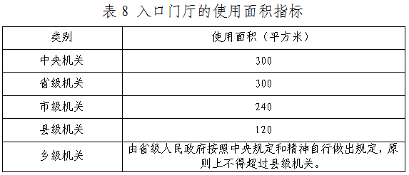 第二十九条党政机关办公用房入口门厅高度不应超过两层,门厅的使用面积不应超过表8的规定: