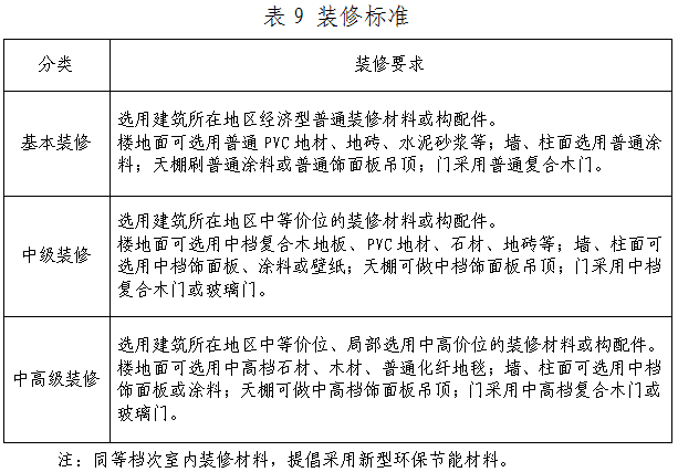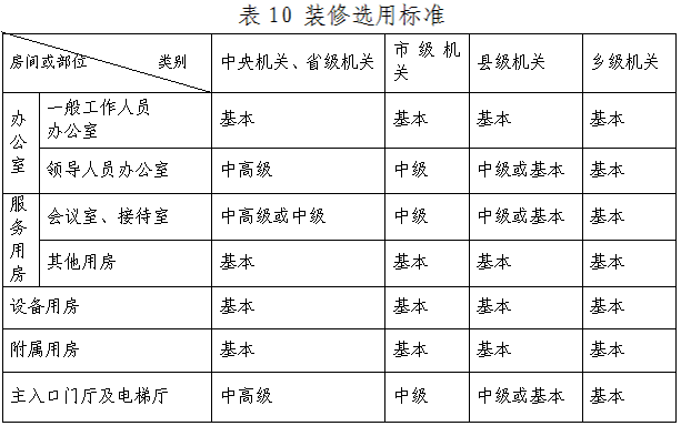 第三十九条党政机关办公用房装修标准可分为基本装修、中级装修、中高级装修三类,并宜符合表9的规定。