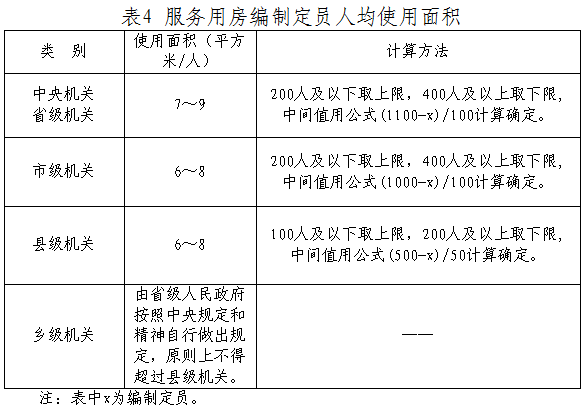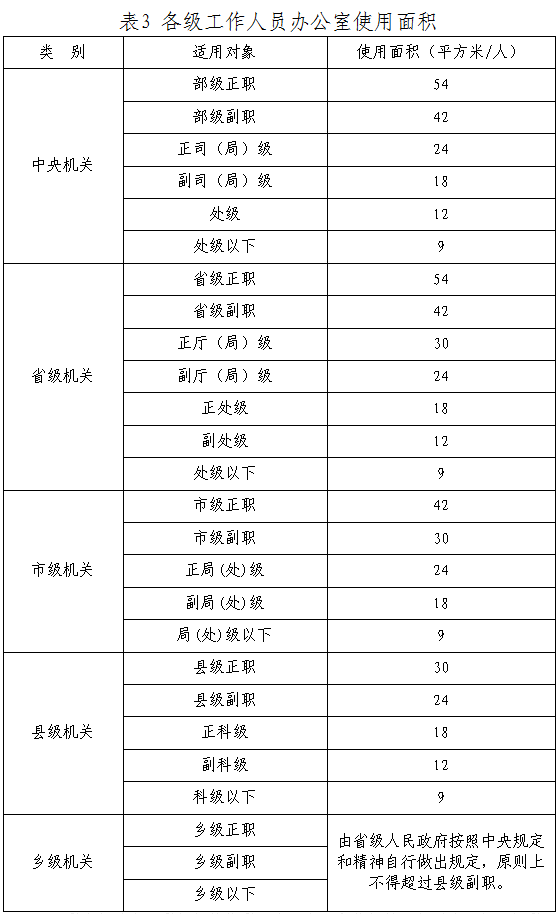 第十一条各级工作人员办公室使用面积指标。具体指标是在1999年标准的基础上结合调研情况,并按照《关于党政机关停止新建楼堂馆所和清理办公用房的通知》(中办发[2013]17号)等文件精神,本着实事求是、从严控制、向基层和普通机关工作人员倾斜的原则综合确定的。表3中使用面积18平方米及以上的,是按设置单间考虑的。同时,考虑到乡级机关办公用房实际情况各地差异很大,比较复杂,本条规定的乡级机关各级工作人员办公室使用面积、第十二条规定的乡级机关服务用房人均使用面积、第二十三条规定的乡级机关建筑容积率指标、第二十九条规定的乡级机关入口门厅使用面积指标,由省级人民政府按照中央规定和精神自行做出规定。