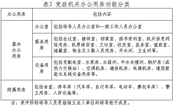 第十条党政机关办公用房功能分类。根据使用功能,办公用房一般划分为基本办公用房(办公室、服务用房、设备用房)、附属用房两类。