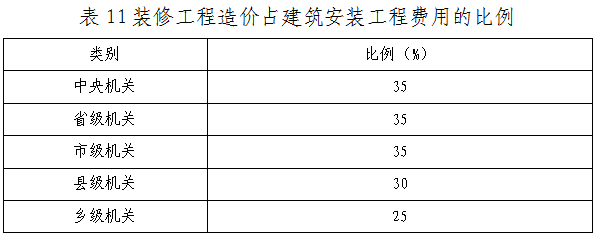 第四十五条党政机关办公用房装修工程造价包括:室内装修工程、室外装修工程造价。装修工程造价占建筑安装工程费用的比例,不宜超过表11的规定。