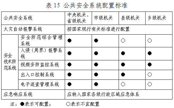 第五十七条党政机关办公用房公共安全系统宜包括火灾自动报警系统、安全技术防范系统及与政府职能相关的应急响应系统等。办公用房内(或部分区域)对安全技术防范具有其他特殊要求的范围,应实施符合特殊安全技术防范管理规定所要求的安全技术措施。系统配置标准宜符合表15的规定。