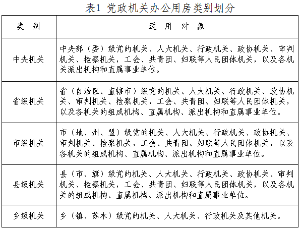 第九条党政机关办公用房根据单位级别和性质分为五类,其适用对象见表1。