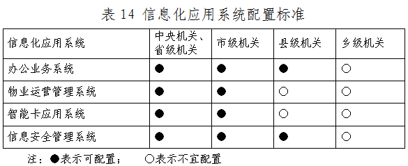 第五十六条党政机关办公用房信息化应用系统宜包括办公业务系统、物业运营管理系统、智能卡应用系统、信息安全管理系统等。系统配置标准宜符合表14的规定。