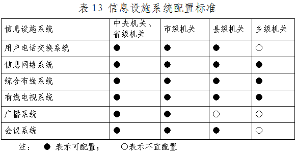 第五十五条党政机关办公用房信息设施系统宜包括用户电话交换系统、信息网络系统、综合布线系统、有线电视系统、广播系统、会议系统等。系统配置标准宜符合表13的规定。