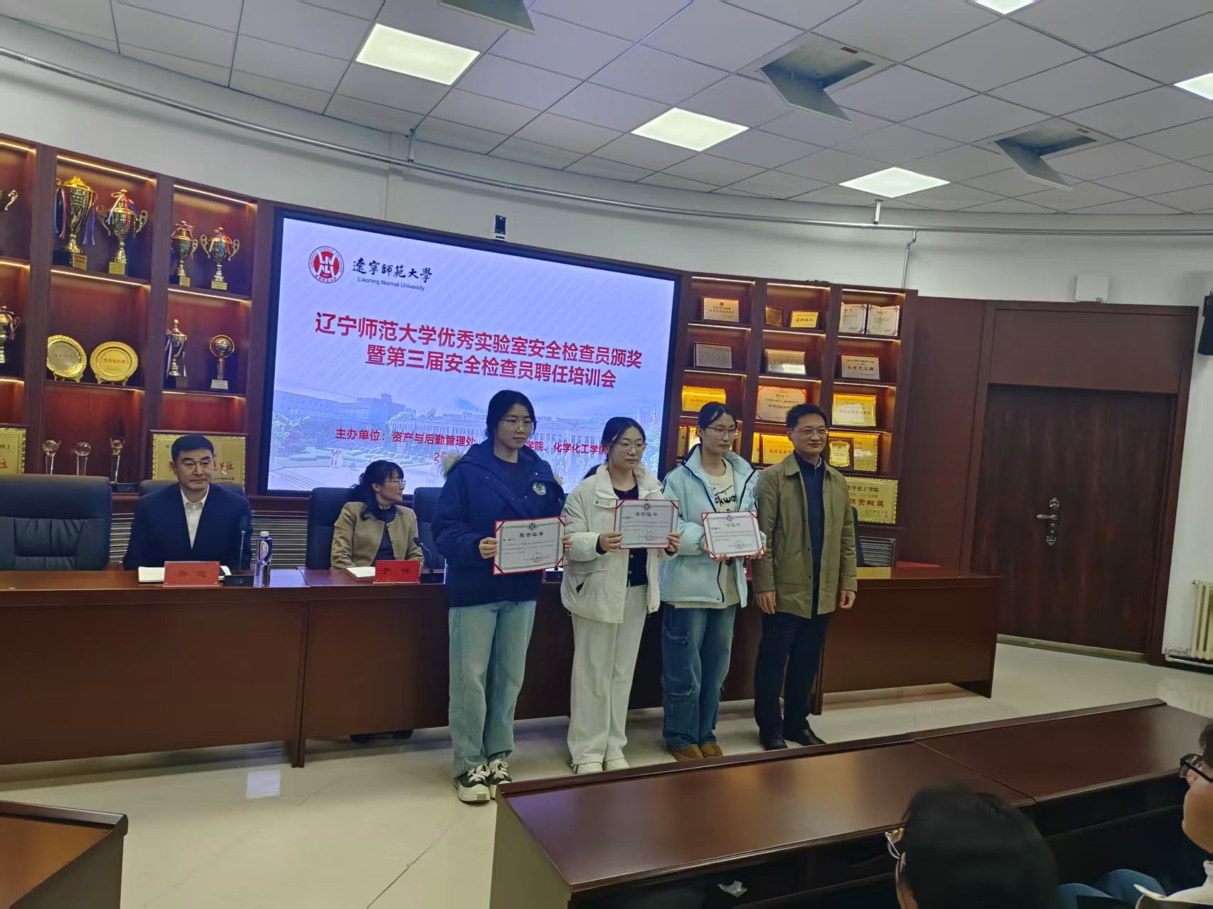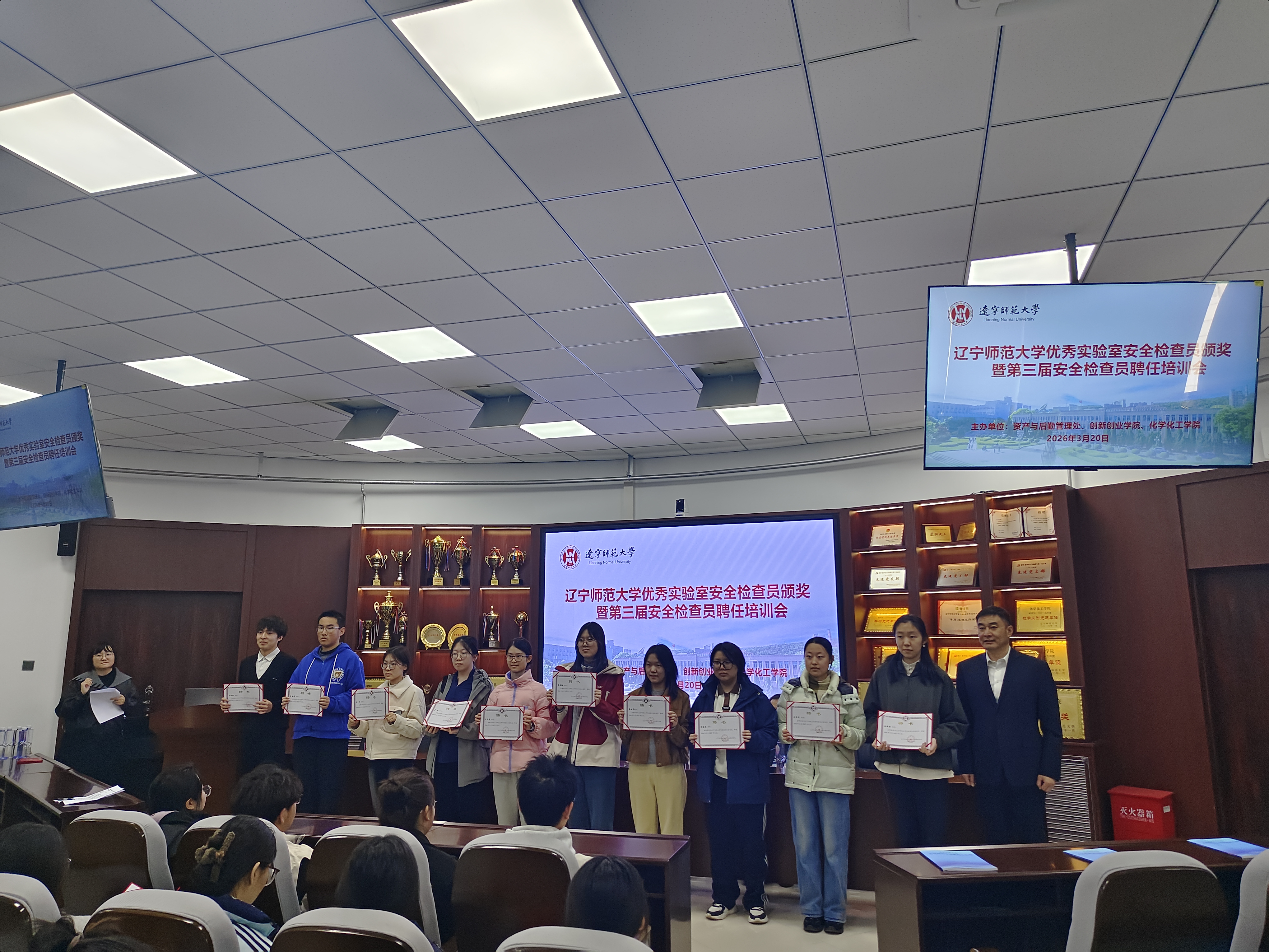 为深入贯彻落实学校实验室安全管理工作要求,强化师生安全责任意识,3月20日中午,我校优秀实验室安全检查员颁奖暨第三届安全检查员聘任培训会在理化大楼C501会议室顺利举行。资产与后勤管理处处长李刚、创新创业学院院长张爽、化学化工学院党委书记于伟、资产与后勤管理处副处长兰贺元、化学化工学院党委副书记齐迎、指导教师李杰兰、实验室安全管理科相关工作人员及全体实验室安全检查员参加会议。会议由实验室安全管理科赵文霞主持。